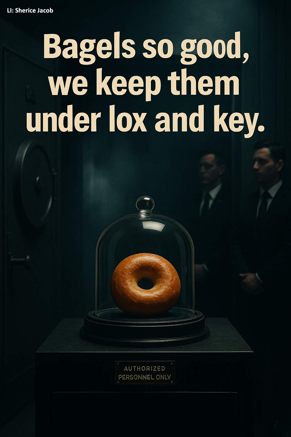 This concept started with a simple wordplay twist — lox and key — and grew into a full high-security visual narrative. Instead of leaning on typical bagel-and-brunch imagery, I flipped the script: what if the bagels were so good, they needed vault-level protection? The humor comes from treating an everyday food with exaggerated seriousness, creating contrast, intrigue, and instant memorability.