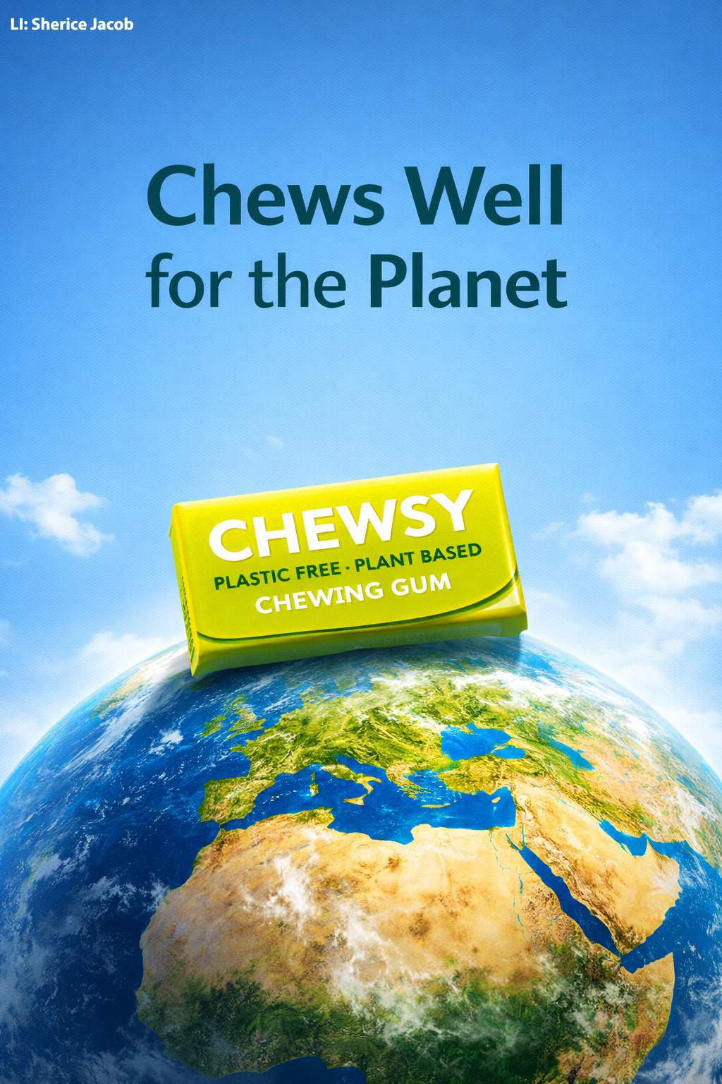 By placing Chewsy on top of the planet, the ad turns a small personal choice intoa global one. The headline "Chews Well for the Planet" borrows the familiar language of health and wellness and redirects it toward environmental care, suggesting that what's good for you can also be good for the planet.