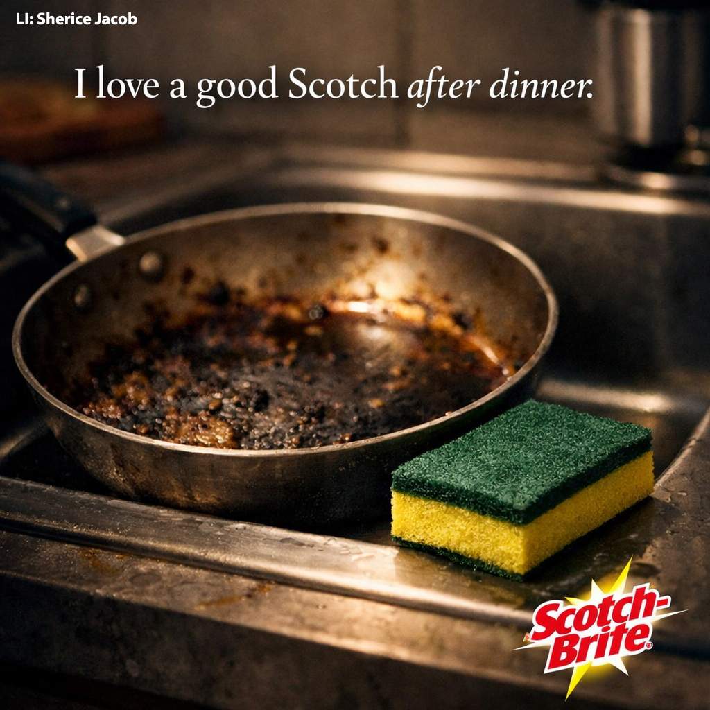 The phrase "a good Scotch after dinner" usually conjures images of slow sips, conmfort, and a job well done. This ad borrows that cultural shorthand and flips it--turning cleanup into the final, satisfying step of a great meal.