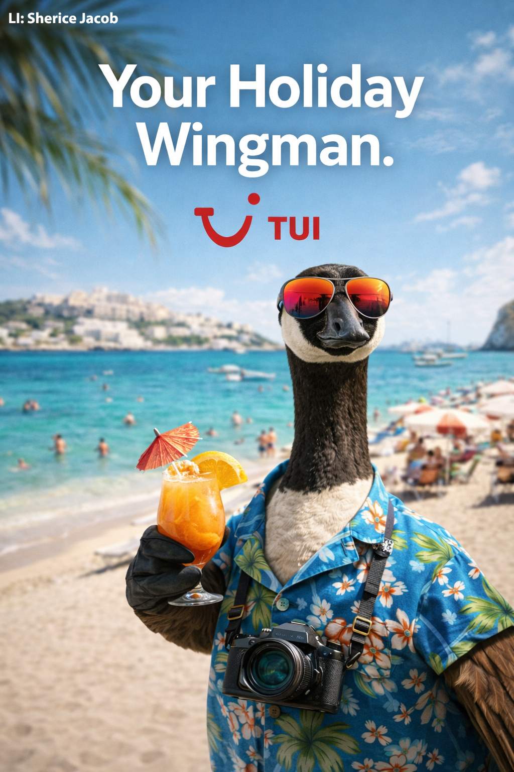 The choice of a goose is intentional. Geese know when it's time to leave. When the seasons change and the temperature dips, they head somewhere warm and cozy. That instinct became the metaphor. TUI is the presence that knows when it's time to take off, where to land, and how to make the journey feel effortless.
